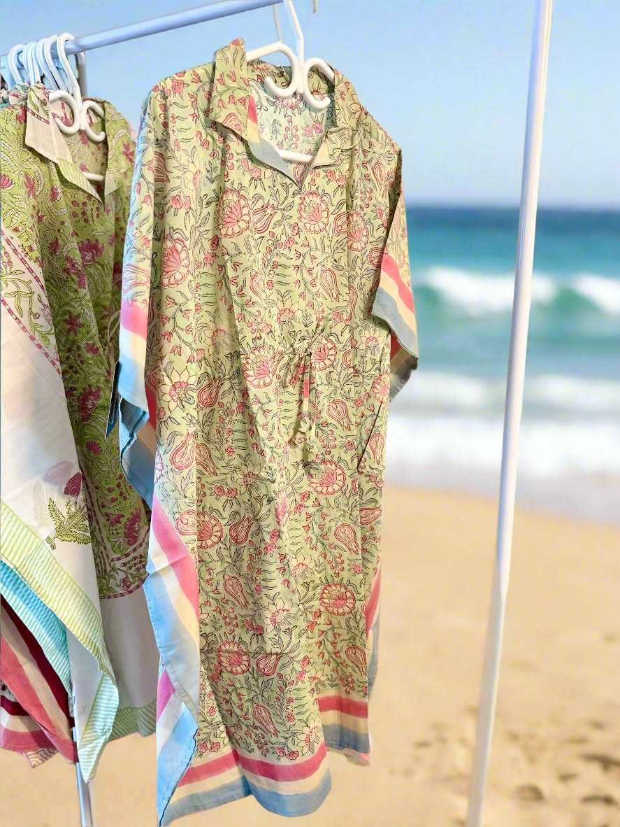Meet your new wardrobe essential – a breezy, beautiful kaftan dress crafted from 100% pure cotton and hand block printed, making each piece truly one of a kind.