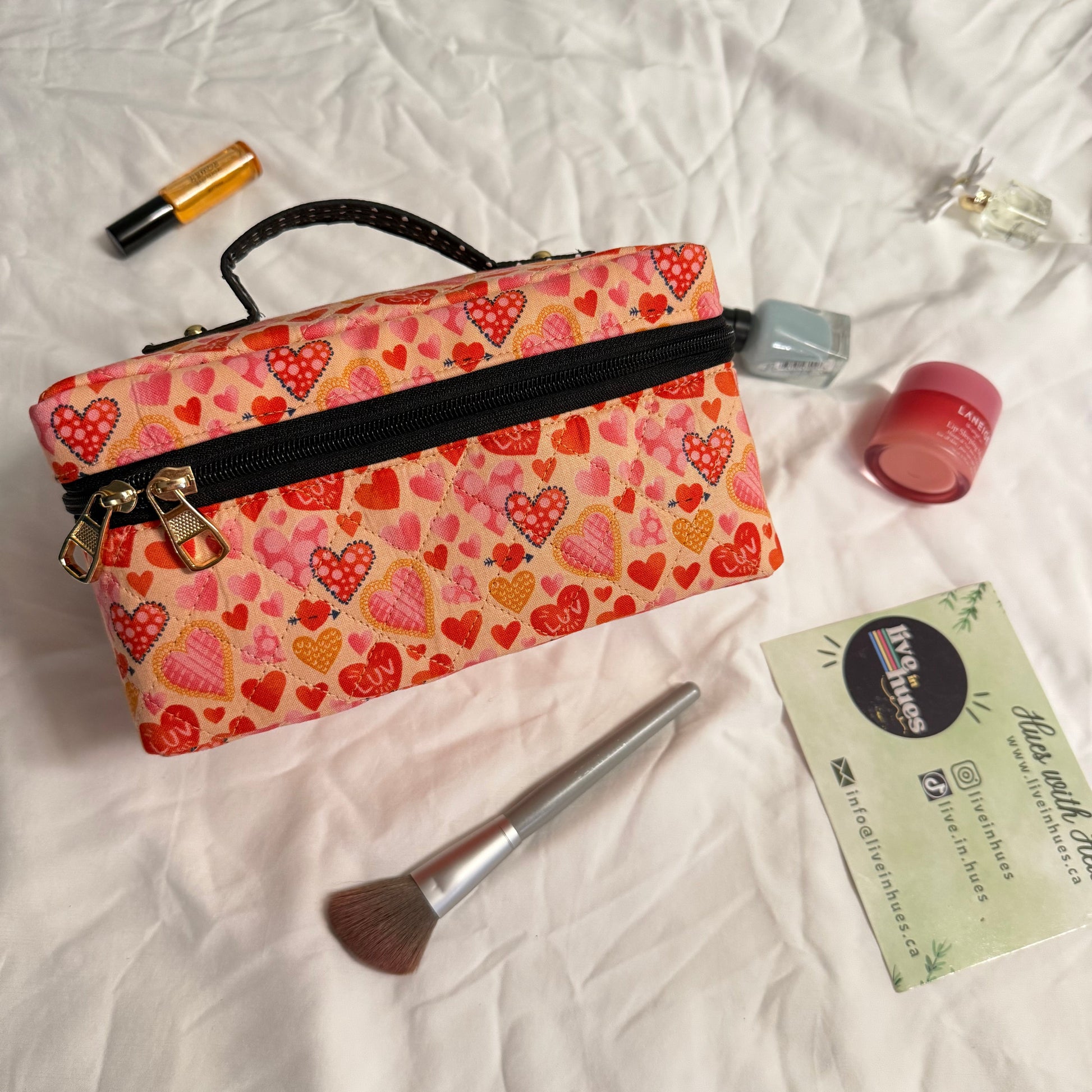 Our handcrafted vanity bags—also known as makeup or cosmetics pouches—are designed to keep your beauty and grooming essentials neatly organized and easily accessible. Featuring a waterproof plastic lining and three inner pockets, these spacious pouches are perfect for makeup, travel necessities, or even kids’ essentials.