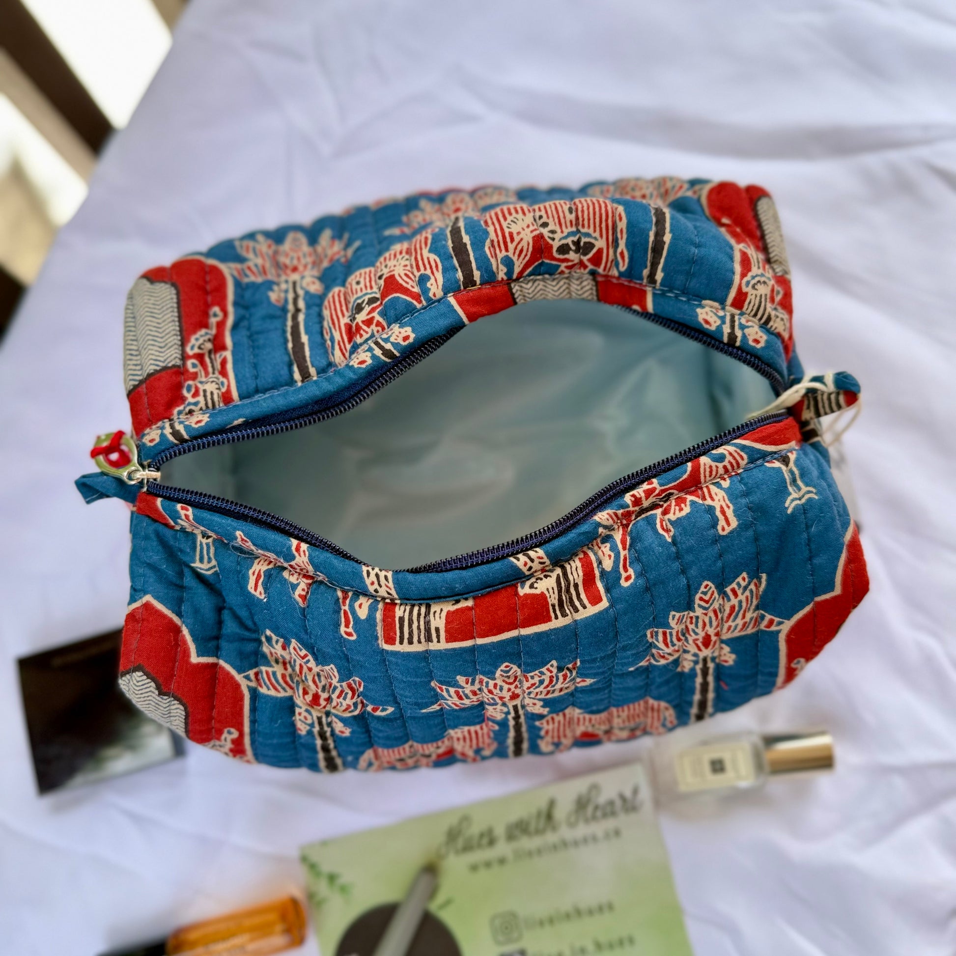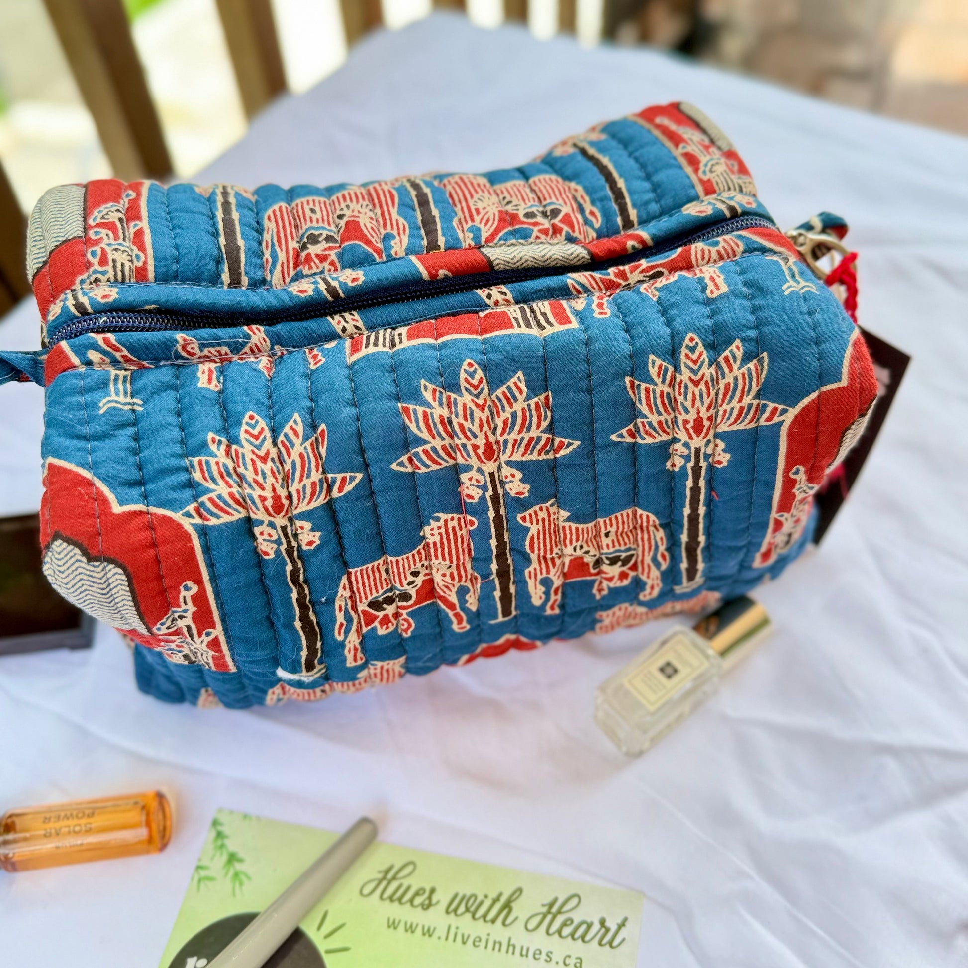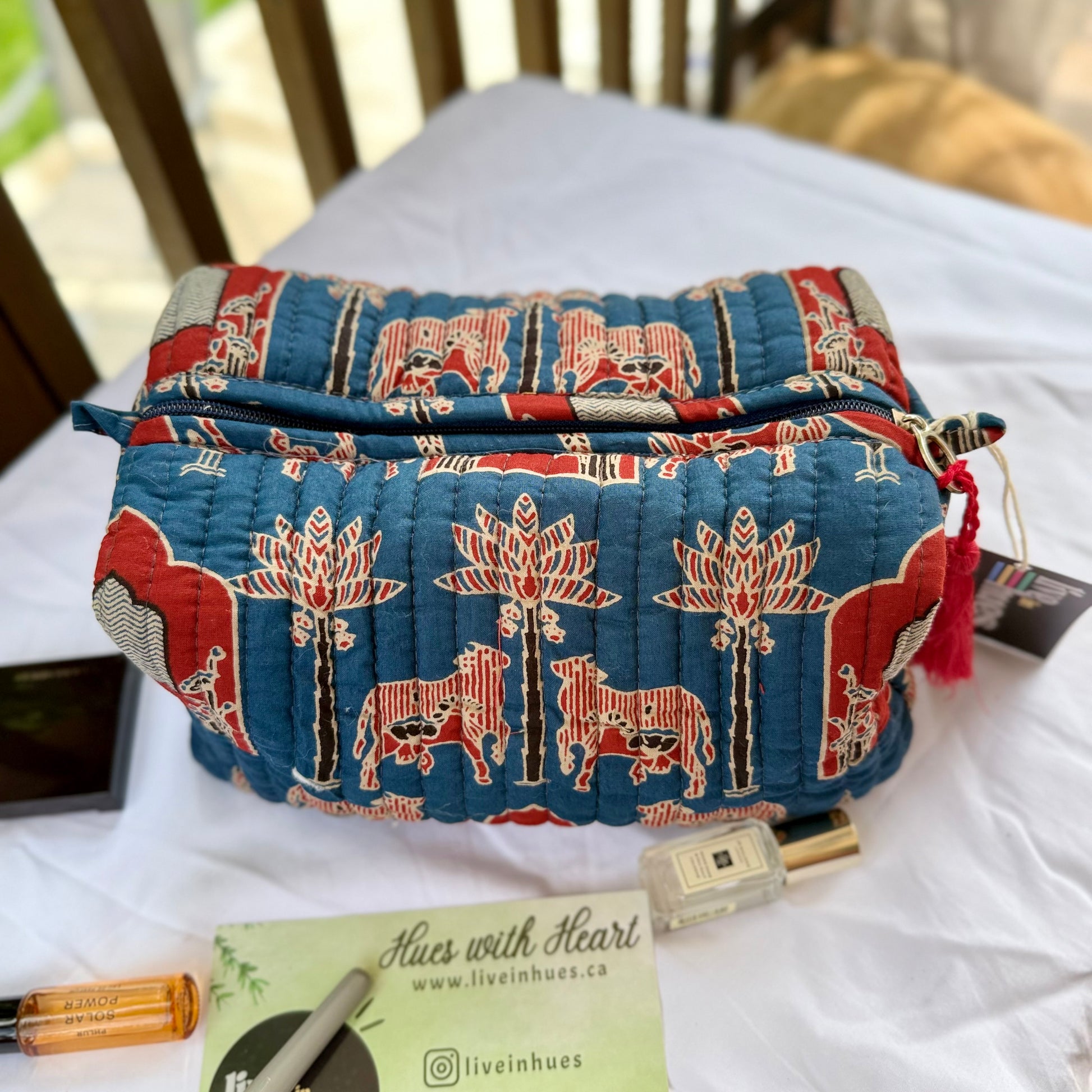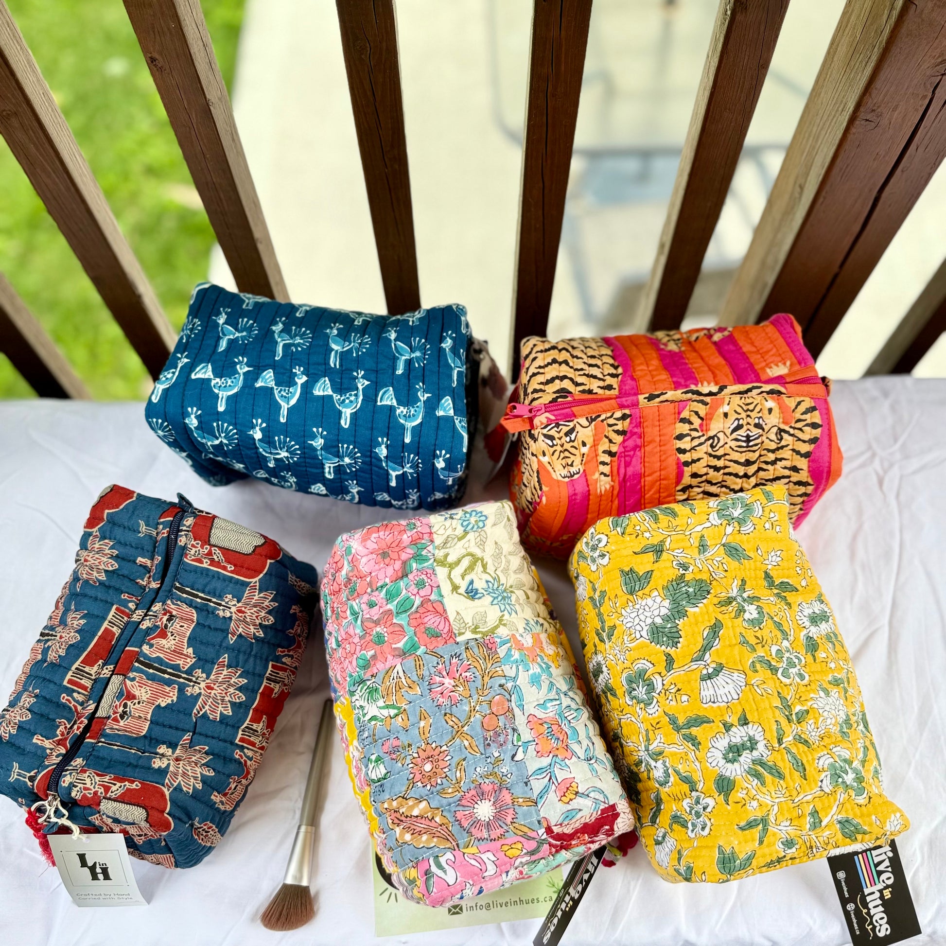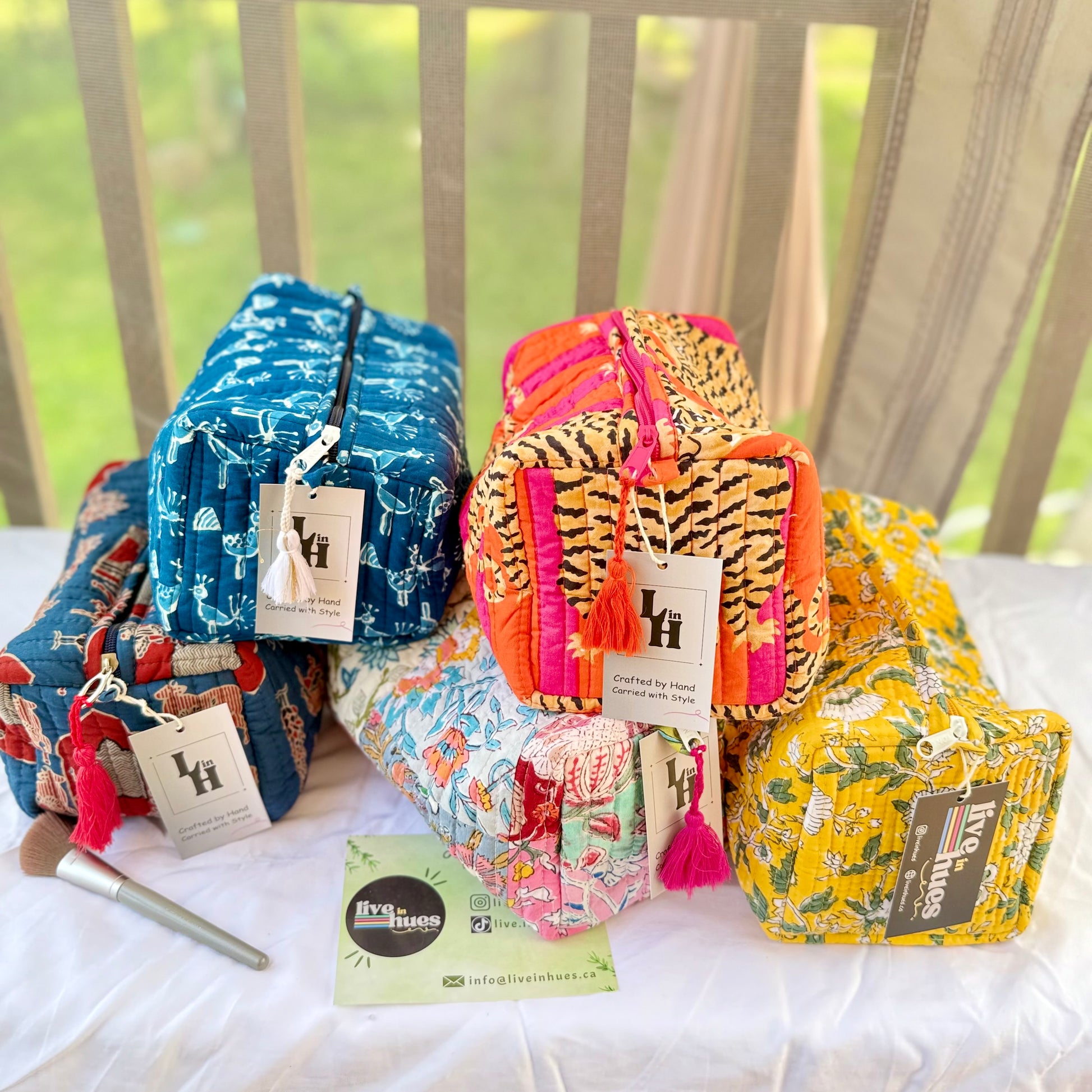 Crafted from hand block-printed cotton and finished with wooden beaded tassels, our Everywhere Pouches are as stylish as they are functional. With a waterproof lining and two inner pockets, they’re perfect for organizing makeup, travel essentials, stationery, or kids’ items.