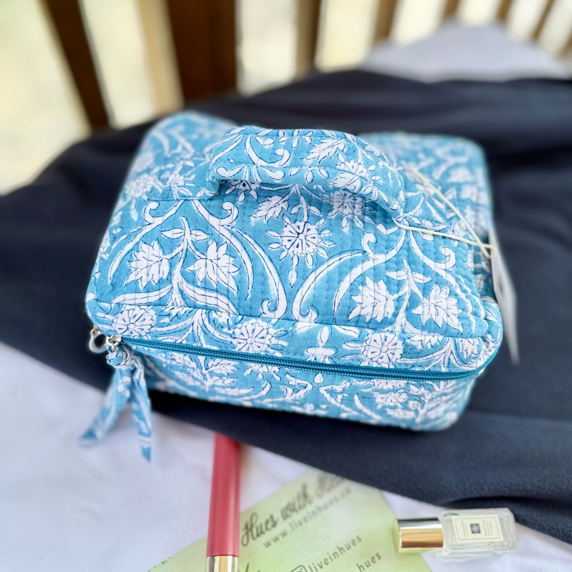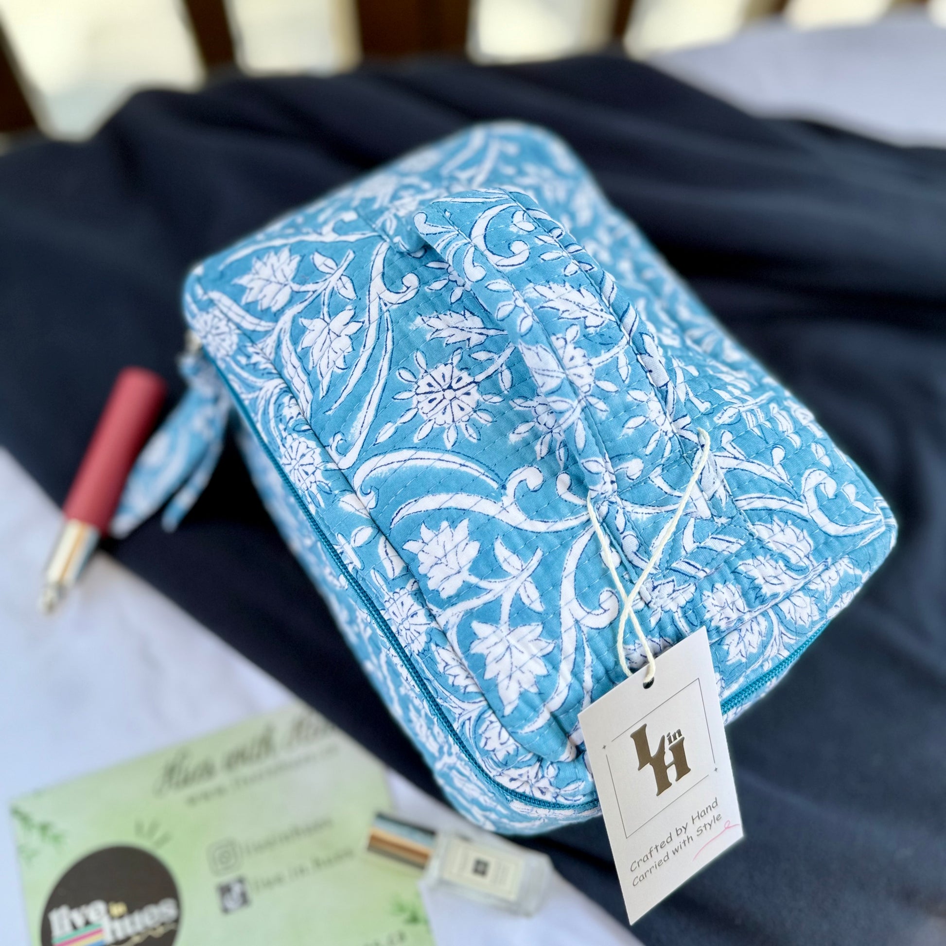 Our handcrafted vanity bags—also known as makeup or cosmetics pouches—are designed to keep your beauty and grooming essentials neatly organized and easily accessible. Featuring a waterproof plastic lining and three inner pockets, these spacious pouches are perfect for makeup, travel necessities, or even kids’ essentials.